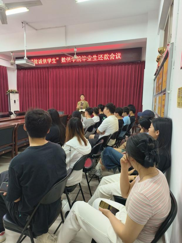 于4月25日举行争做“诚信学生”毕业生还款教育会议,2024届全体贷款毕业生参加。学工办副主任陈婷主持会议。