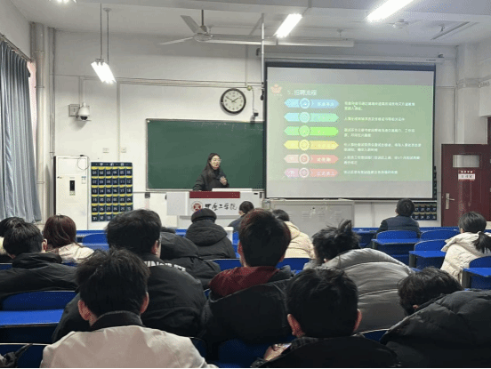 的校企合作单位郑州市文升道职业培训学校展开专场招聘宣讲会。校招负责人董老师就公司文化、岗位类型、职业前景、薪资待遇、面试流程等方面进行详细介绍。在场学生积极参与互动,部分同学已初步达成就业意向。