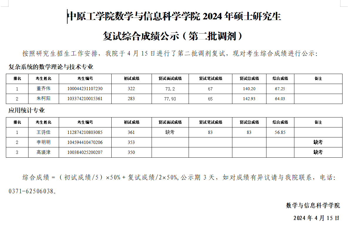 中原工学院91国产 2024年硕士研究生复试综合成绩公示(第二批调剂)