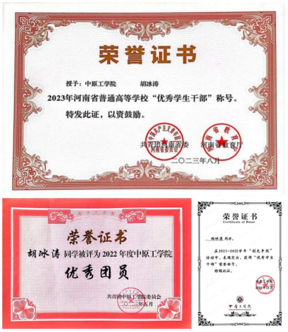 作为新时代的青年,在学好本专业课程期间,辅修第二学位计算机科学与技术专业。他积极致力于学科竞赛,不断提升自身能力。在老师的悉心指导下,他潜心钻研,积极拓展课外知识,投身于未来就业选择中,将自己的知识应用于自己未来职业选择中。曾获得“正大杯”第十三届全国大学生市场调查与分析大赛(本科组)国家二等奖,第十届全国大学生光电设计竞赛中部赛区三等奖,第十四届大学生数学竞赛(数学类)二等奖,河南省大学生校园科技创意大赛二等奖、2022年度校专项(学科竞赛)奖学金。
